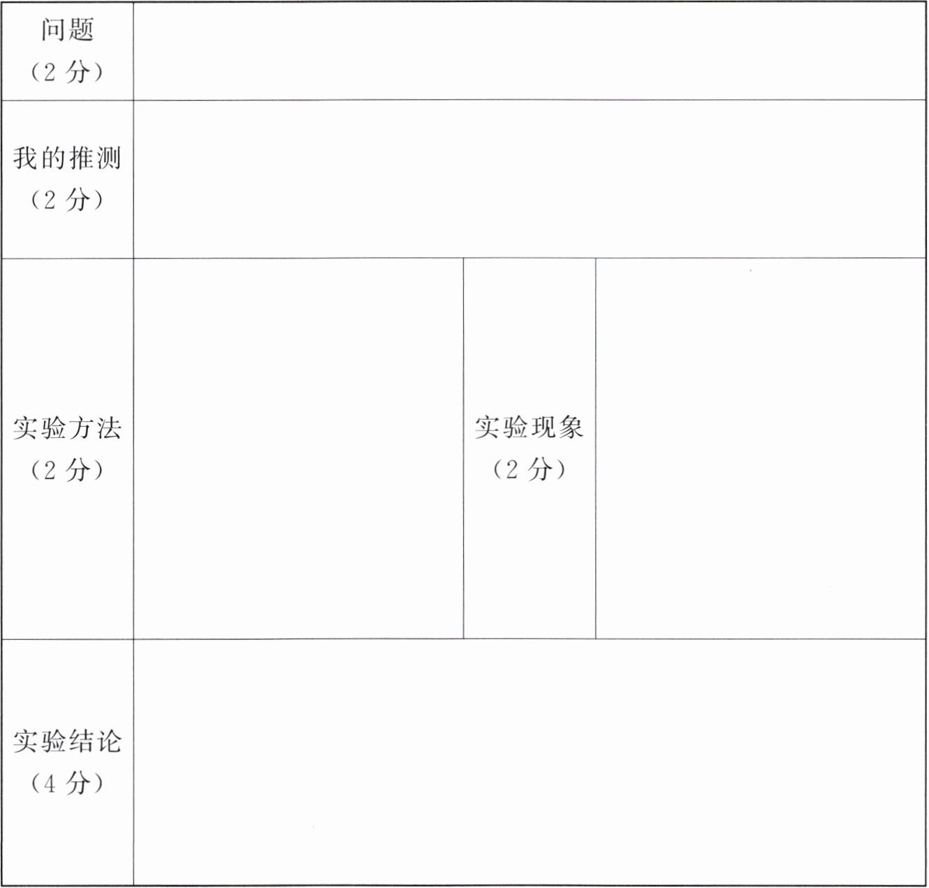 | 问题(2 分) | 将一张普通 A4 纸弯折成拱形并抵住两端,与用不加工不变形的纸直接搭成桥面相比,哪种的承重能力强? |