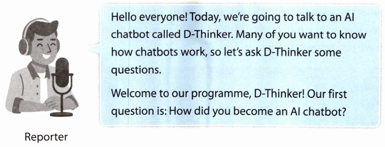Hello everyone! Today, we're going to talk to an AI chatbot called D-Thinker. Many of you want to know how chatbots work, so let's ask D-Thinker some questions.