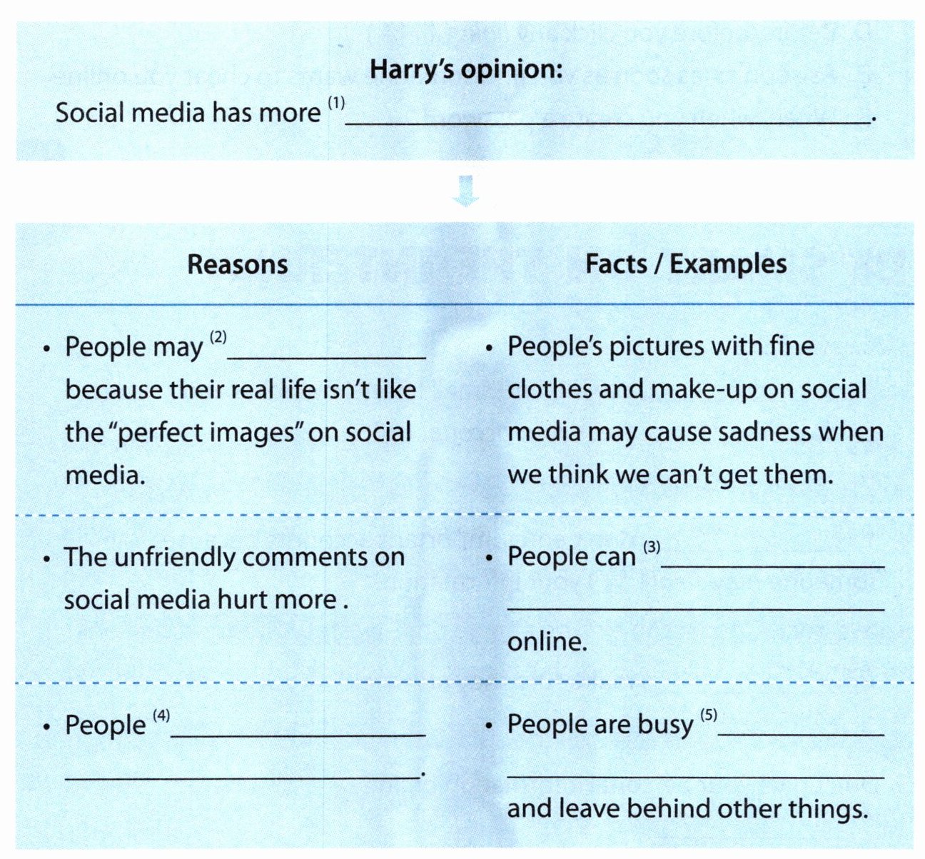 3-2 What is Harry's opinion on social media? Complete the following diagram. 哈利对社交媒体有什么样的看法?填写下列图表。