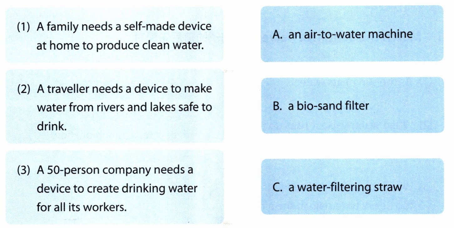 3-3 (Answers may vary.) I like the air-to-water machine best, because it's very creative and useful. It does not need traditional water sources and can be used anywhere as long as there is electricity.