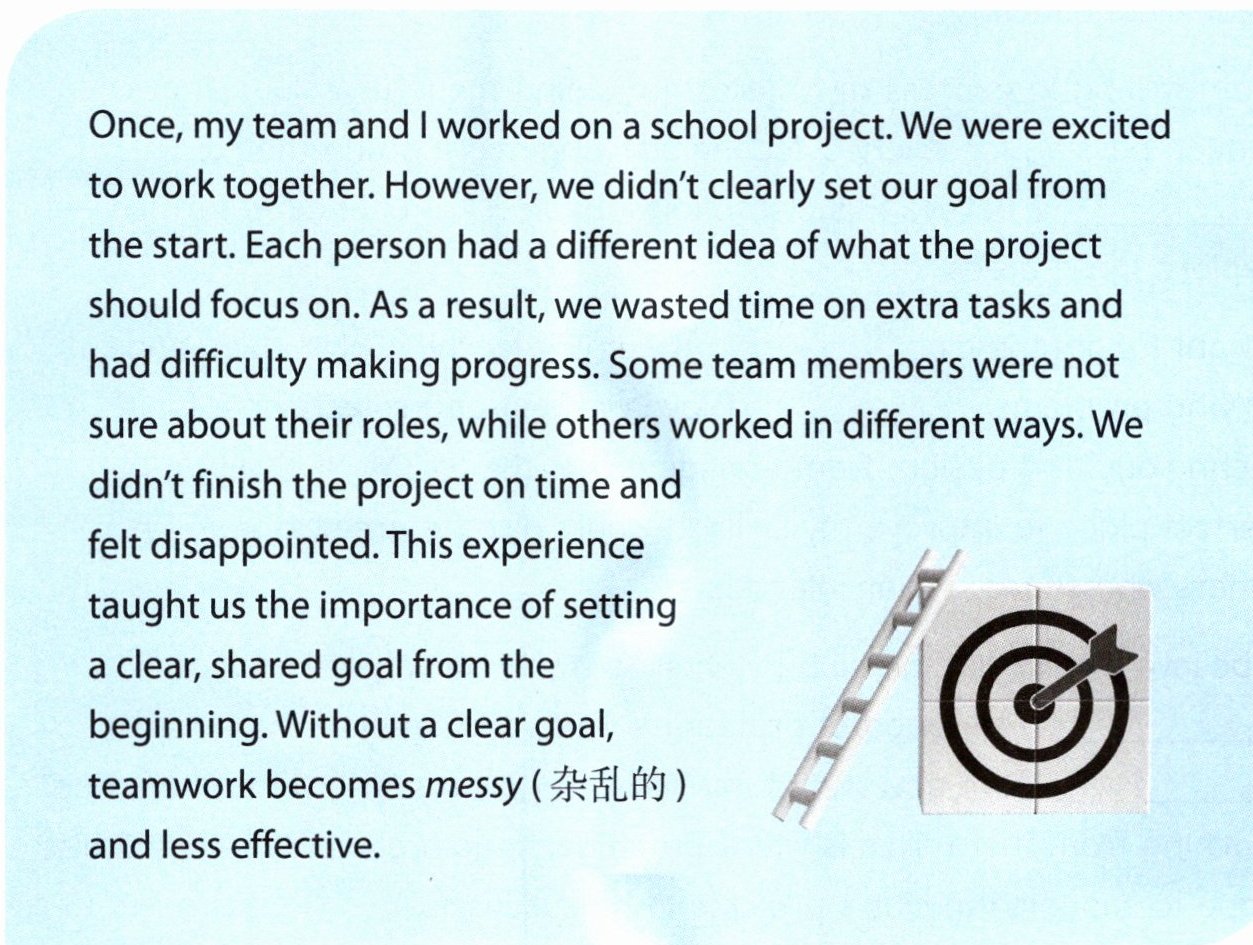 3、(Answers may vary.)Sample 1: I felt sad and disappointed because we didn't work together. This experience taught me that clear goals are important for teamwork to succeed. (A+B)Sample 2: This experience taught me the importance of setting clear goals from the beginning. What do you think of it? (B+D)Sample 3: For anyone working in a team, make sure everyone is on the same page to avoid confusion and failure. (C)Sample 4: This experience taught me the importance of setting clear goals from the beginning. So, next time you're working in a team, make sure everyone is on the same page. (B+E)