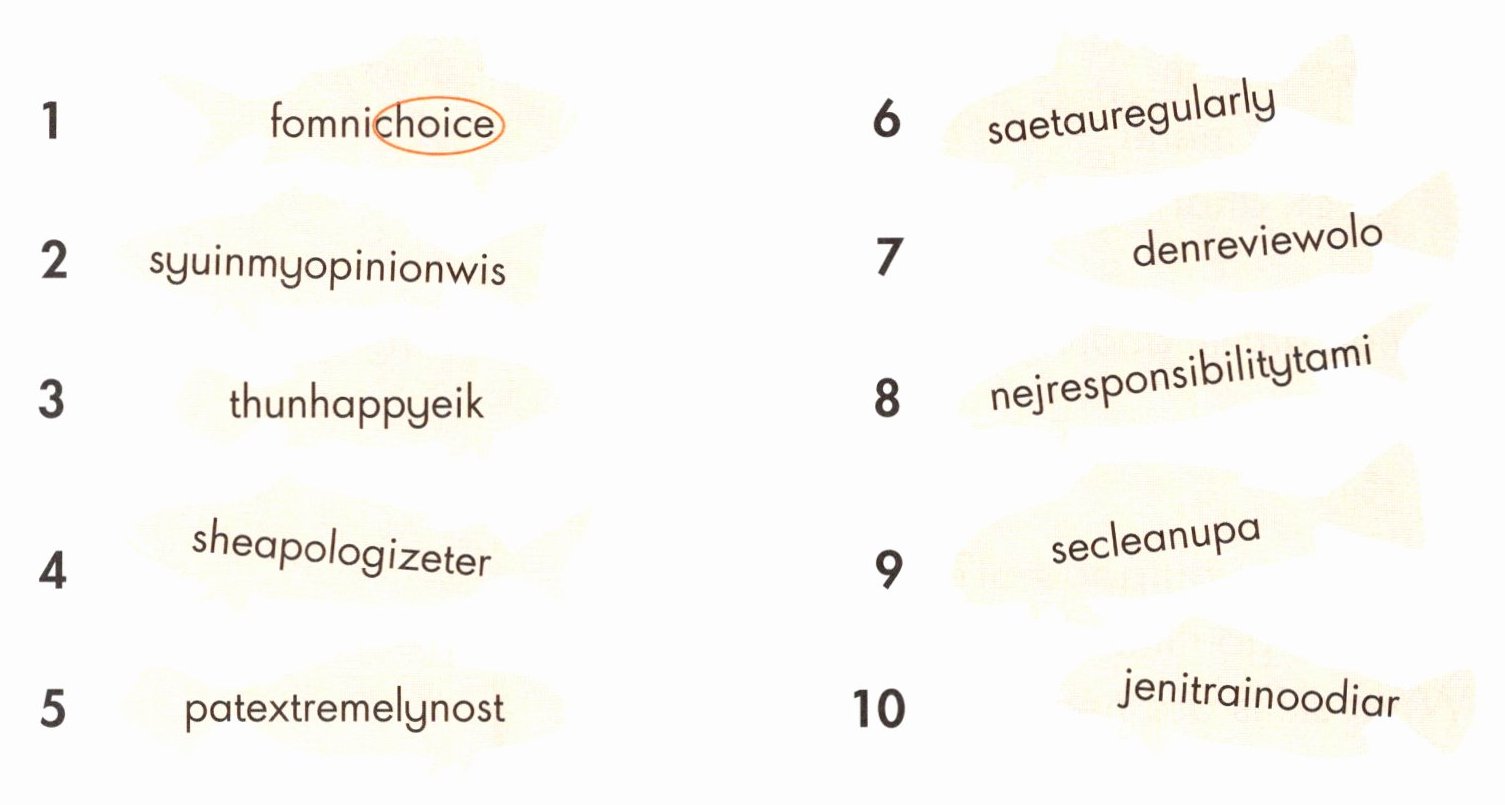 1 regularly 2 in my opinion 3 extremely 4 responsibility 5 apologize 6 unhappy 7 choice 8 train 9 clean up 10 review