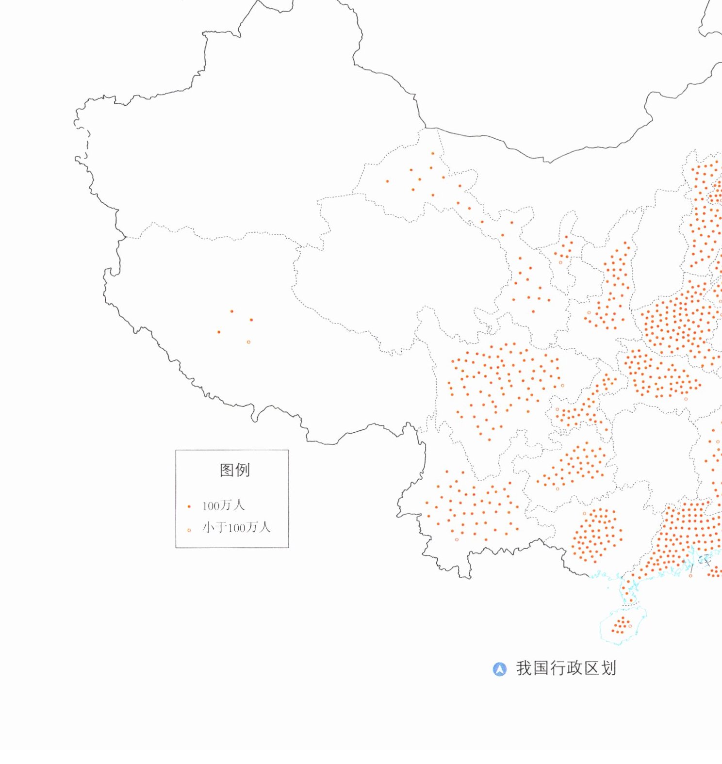 步骤3 绘制点:在下页“我国行政区划”图上,根据计算的部分省级行政区的人口点数,用相应的点均匀布点。(注:实心点代表100万人,空心点代表不足100万人)