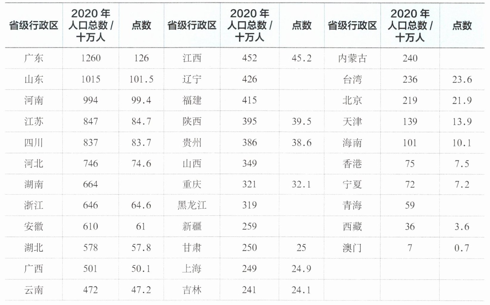 | 省级行政区 | 2020年人口总数/十万人 | 点数 | 省级行政区 | 2020年人口总数/十万人 | 点数 | 省级行政区 | 2020年人口总数/十万人 | 点数 |