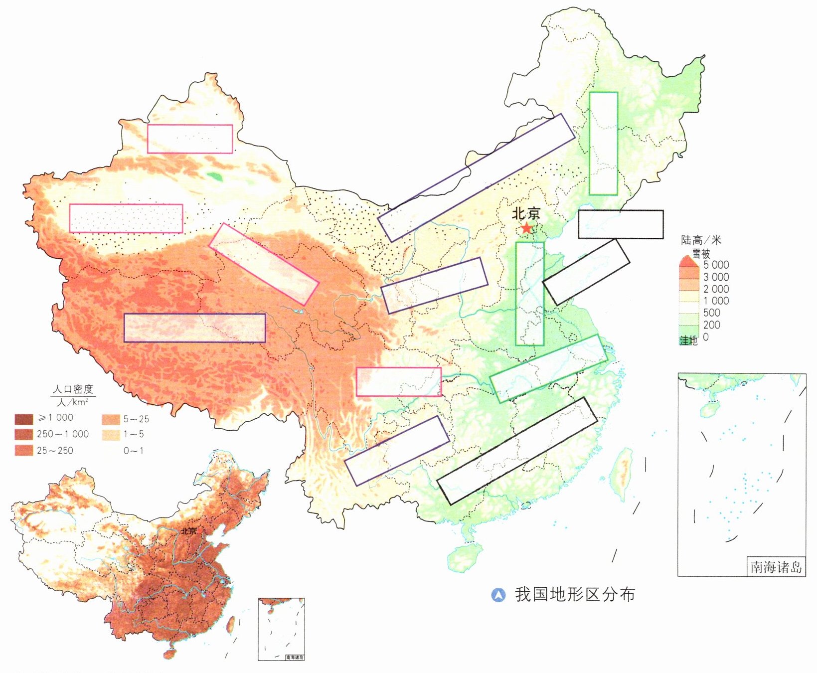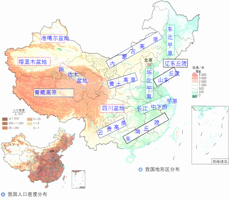 2 在学习我国地形以后,同学们发现地形与我国人口分布有一定的相关性。请对照“我国人口密度分布”图,在“我国地形区分布”图中填写以下内容。