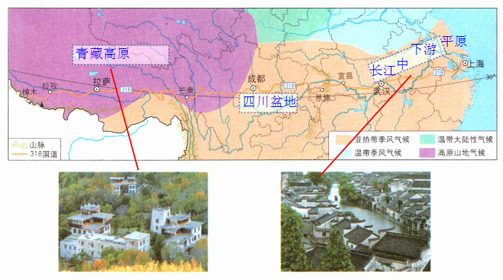 气候角度:318国道与北纬30°纬线大致平行,依次经过了______气候区和______气候区,从温暖到寒冷、从湿润到半干旱,温度、湿度差异显著。