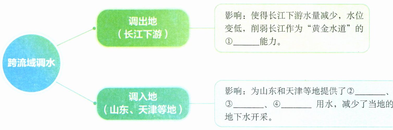 (3)以南水北调东线工程为例,思考跨流域调水对水资源调入地和调出地的影响,并完成下面的思维导图。