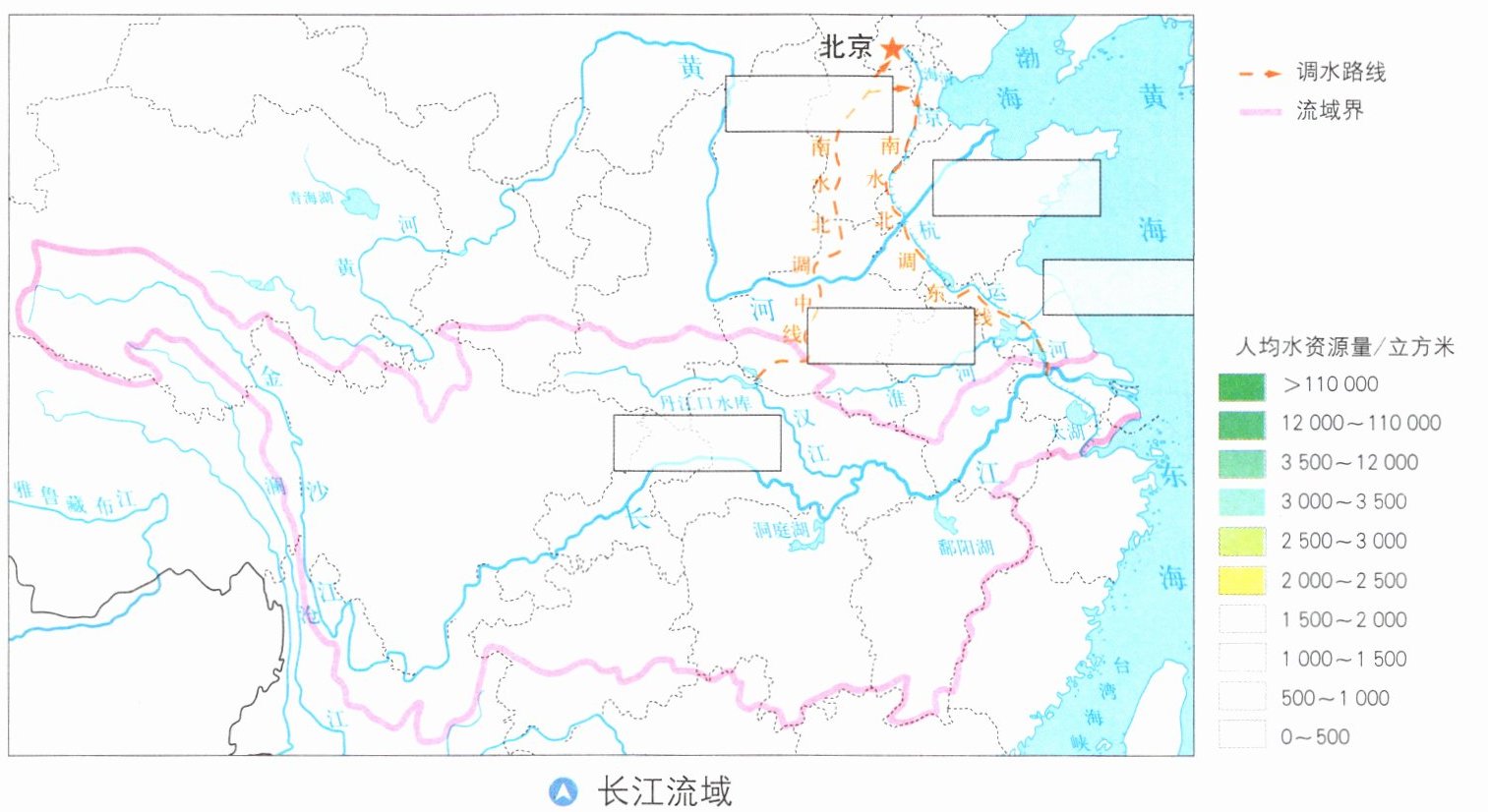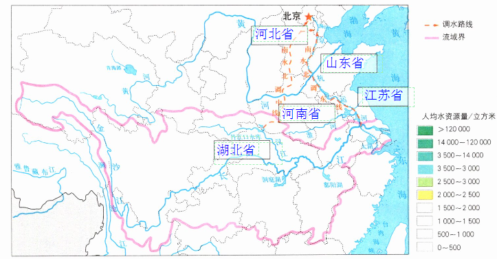 (2)参考课本第69页图3-6,完善图例设计,并按人均水资源量的图例绘在中线、东线工程流经的省级行政区中。