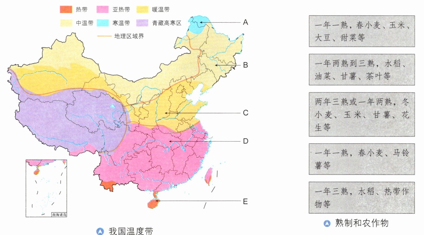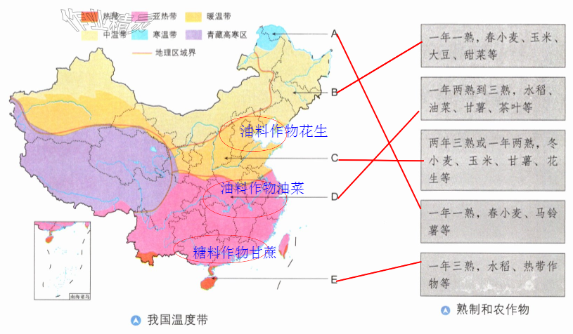 (1)将上图中温度带与其相应的熟制和农作物连线。