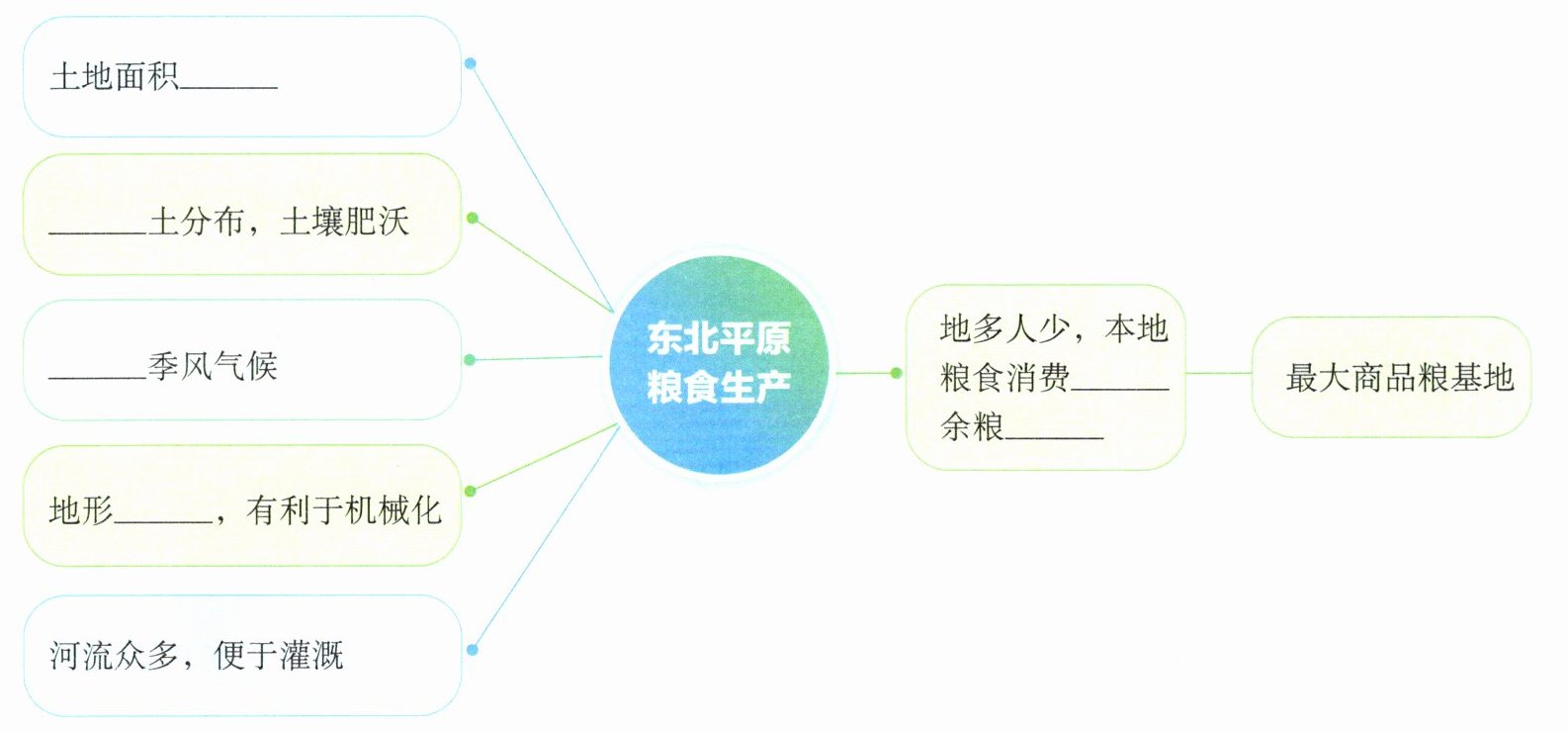 (3)东北平原盛产的粮食作物有______。以“东北平原主产区”为例,思考粮食生产条件和商品粮基地的关系,并完成下列思维导图。