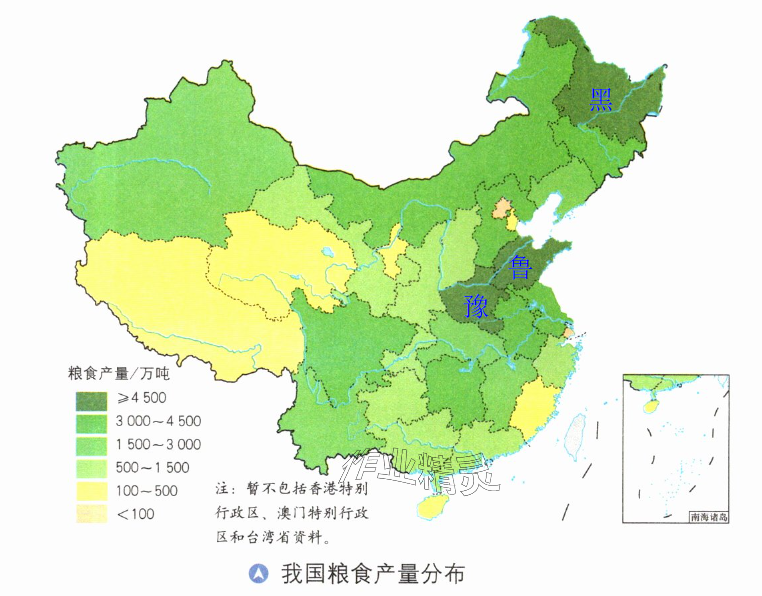 (2)图略(按照右侧示例,在“我国粮食产量分布”图中,东北平原主产区范围大致在黑龙江、吉林、辽宁三省部分区域;新疆甘肃主产区范围大致在新疆和甘肃部分区域绘制相应范围线条)