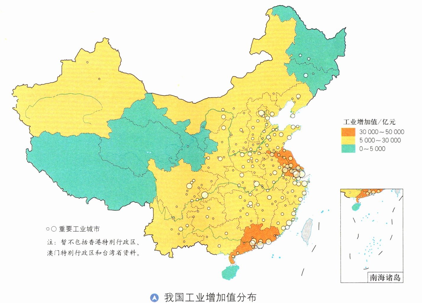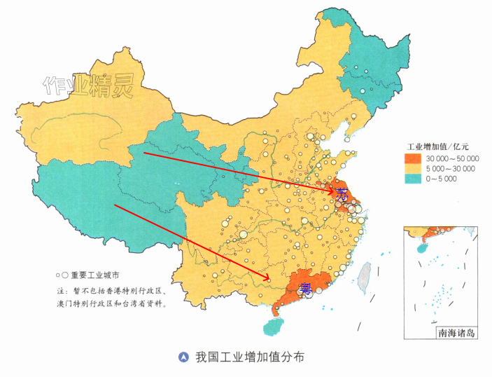 (1)标注工业增加值30 000~50 000亿元的省级行政区简称,并结合教材,在图上绘出2035年我国电力流规划大致方向。