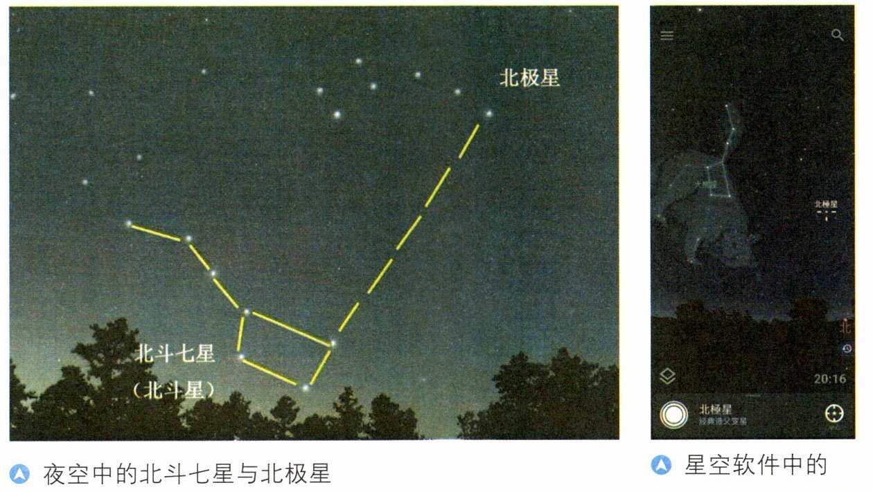 在北半球中纬度地区,只要是晴朗的夜晚,几乎常年可以观测到北斗七星(在秋季的几周内北斗七星会靠近地平线或位于地平线之下)。北斗七星就像天空中的路标,能够指引我们找到一些恒星和星座。例如,将北斗七星斗口的两颗星连线,朝斗口方向延长约5倍远,就能找到北极星。北极星总是出现在正北方。