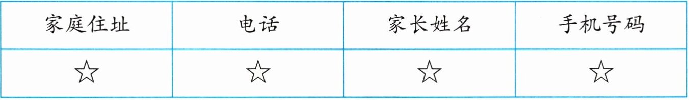 请记住你的家庭住址、电话、家长姓名、手机号码等重要信息,并让家长考考你。如果答对就将☆涂色。