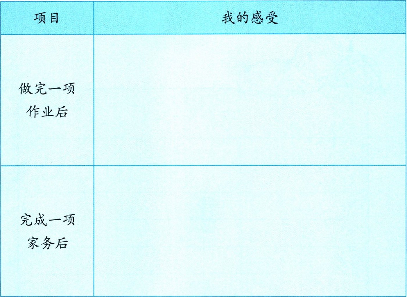 在成长的过程中,我们不断学习。在学校里,我们学习新知;在家里,我们学做家务。对照一下,自己做作业和做家务的感受有什么不同?请填在表格里。