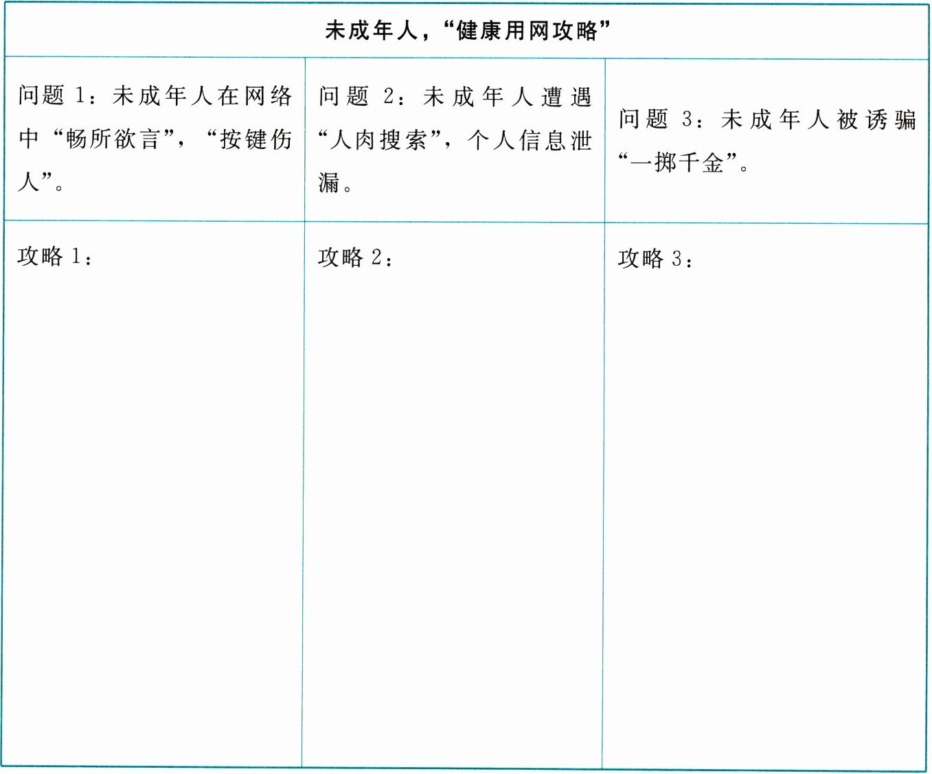 |问题1:未成年人在网络中“畅所欲言”,“按键伤人”。|问题2:未成年人遭遇“人肉搜索”,个人信息泄漏。|问题3:未成年人被诱骗“一掷千金”。|