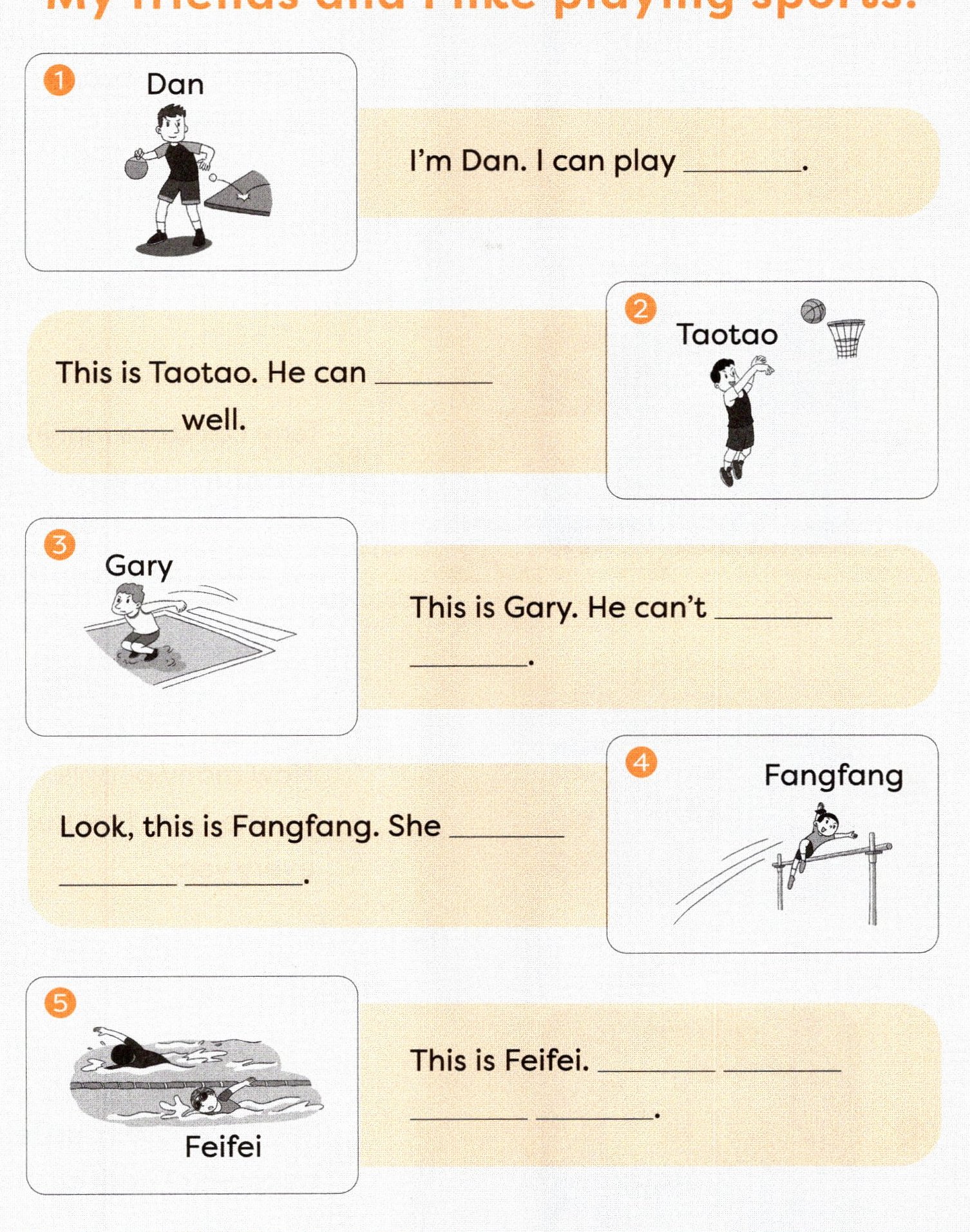 1 ping-pong 2 play basketball 3 jump far 4 can jump high 5 She can't swim fast