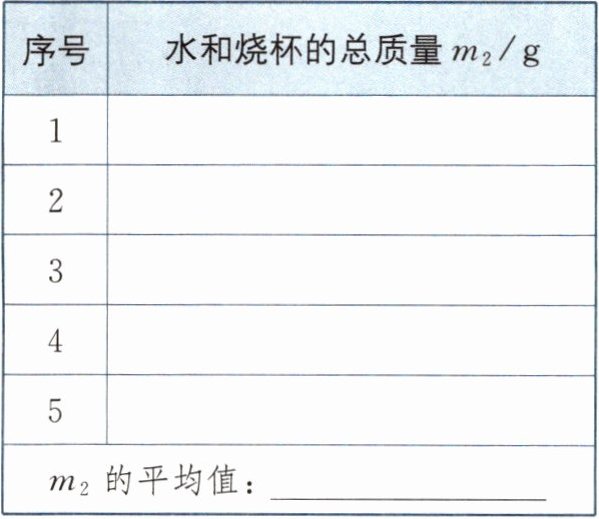 2. 用托盘天平多次测量烧杯的质量 $ m_1 $、水和烧杯的总质量 $ m_2 $,将测得的数据分别填入表 1 - 3 - 2 和表 1 - 3 - 3 中。分别求出 $ m_1 $ 和 $ m_2 $ 的平均值,然后求出烧杯中水的质量 $ m_{水} $。