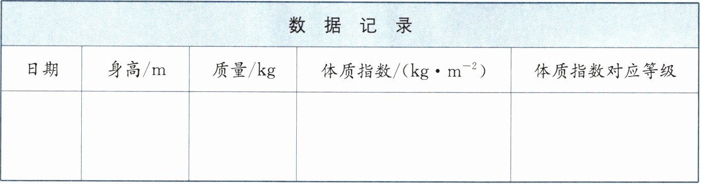 | 日期 | 身高/m | 质量/kg | 体质指数/($kg \cdot m^{-2}$) | 体质指数对应等级 |