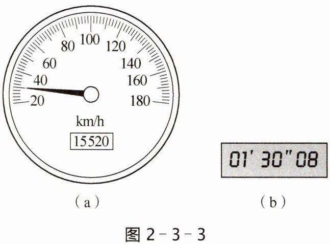 2. 小悟同学想知道家里汽车的速度表是否准确,就让爸爸驾车保持如图 $ 2 - 3 - 3 $(a)所示的速度通过长度为 $ 0.72 \, km $ 的大桥,用电子秒表测得所用时间如图 $ 2 - 3 - 3 $(b)所示。请通过计算判断汽车速度表是否准确。若不准确,汽车速度表所示速度是偏大还是偏小?