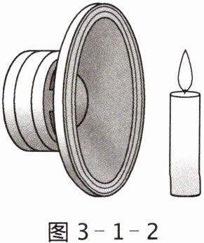 如图3-1-2所示,在扬声器的前方放置一支点燃的蜡烛,打开扬声器播放音乐。观察扬声器的纸盆和烛焰,它们分别有什么变化?与同学交流,说一说两者之间可能存在的联系。