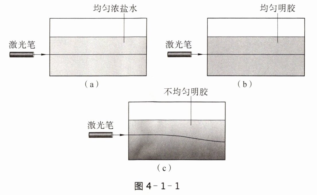 如图4-1-1所示,将激光分别射向均匀浓盐水、均匀明胶和不均匀明胶,观察光在其中的传播。