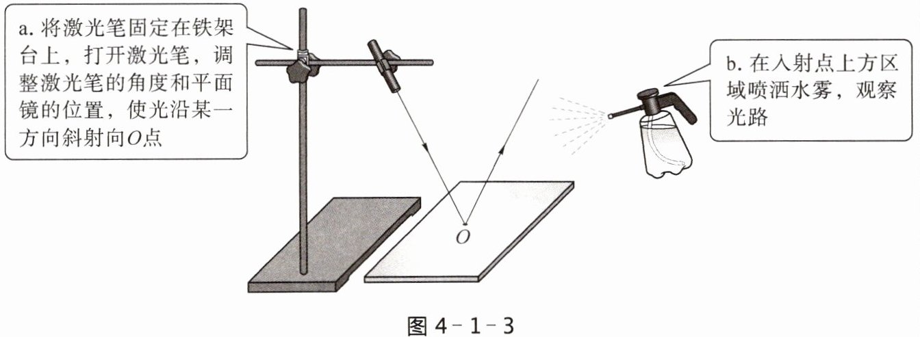 2. 如图4-1-3所示,将一束激光斜射向平面镜上的O点,然后在入射点上方喷洒水雾,观察光路。