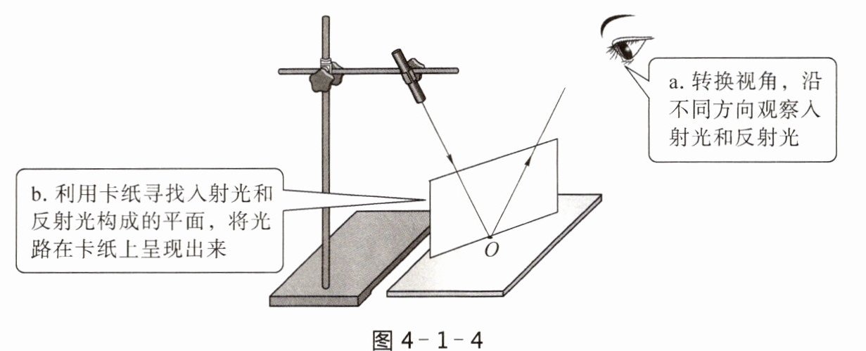 3. 如图4-1-4所示,转换视角观察入射光和反射光,并用卡纸寻找入射光和反射光构成的平面。