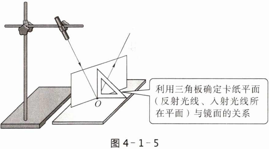 4. 如图4-1-5所示,观察卡纸平面与镜面的关系,利用三角板确定卡纸平面和镜面的关系。
