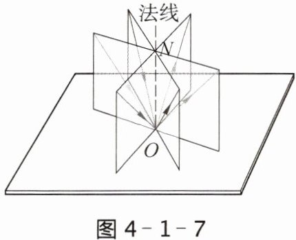 2. 如图4-1-7所示,光沿不同方向射向同一点,入射光线与其对应的反射光线构成的平面之间有什么相同之处?反射光线、入射光线与法线之间有怎样的关系?