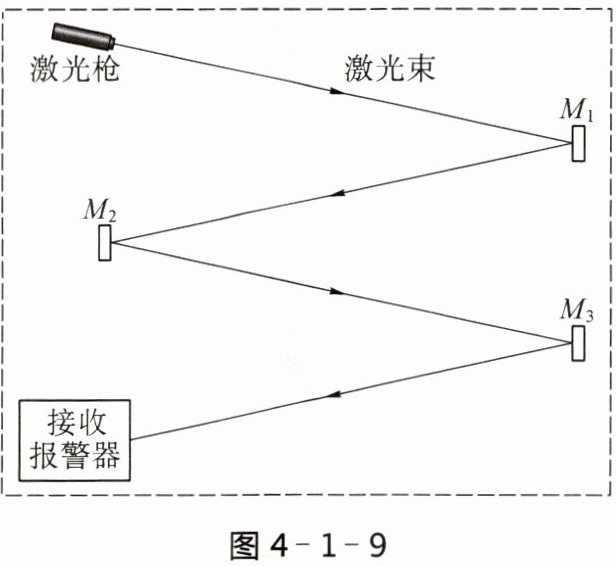 2. 图4-1-9是激光防盗系统的示意图,从激光枪发出的激光束经过平面镜$M_1、$$M_2、$$M_3$_________后到达接收报警器。如果有人闯入激光束区域,激光束就会被隔断,报警器就会发出警报。