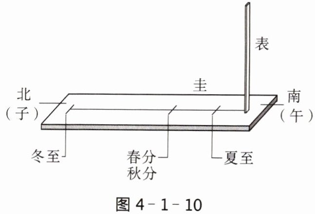 3. “圭表”是利用日影的古代天文仪器,其示意图如图4-1-10所示。其中,正南北方向平放的尺叫做圭,直立在平地上的石柱叫做表。当日光照射表的时候,圭上显现了表的影子。根据正午时表影长度的变化,可以推算二十四节气。试画一条光线,使其经过表的上方,投到“冬至”节气位置。