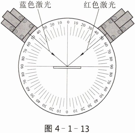 如图4-1-13所示,用一束蓝色的激光逆着红色反射光线方向射向镜面,观察蓝色反射光线与红色入射光线的方向及位置关系。和同学交流,这一现象表明了什么?