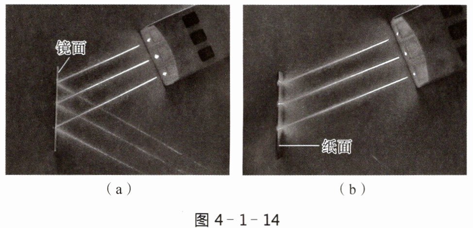 用平行的多束激光分别射向平面镜和白纸,如图4-1-14所示,观察反射光线有什么差异。