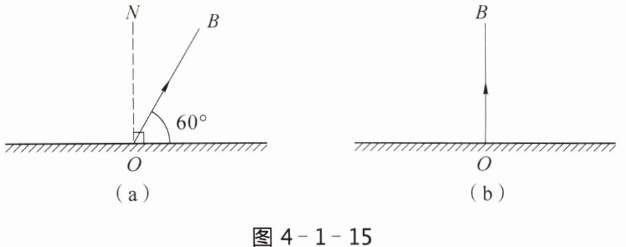 1. 在图4-1-15中,根据给出的反射光线OB画出入射光线AO,并标出入射角$θ_1$及其度数。
