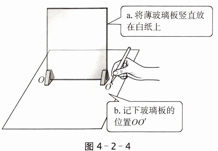 1. 如图4-2-4所示,在水平桌面上铺一张白纸,将薄玻璃板竖直放在白纸上,记下玻璃板的位置OO'。
