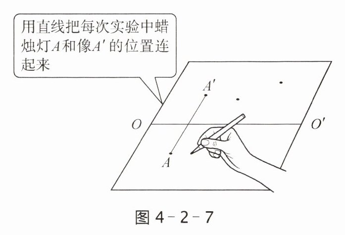 7. 记录数据:如图4-2-7所示,用直线把每次实验中蜡烛灯A和像A'在纸上的标记连起来。观察这些连线与OO'之间的位置关系,并用刻度尺量出蜡烛灯A和像A'的位置到OO'的距离,将数据填入表4-2-1中。