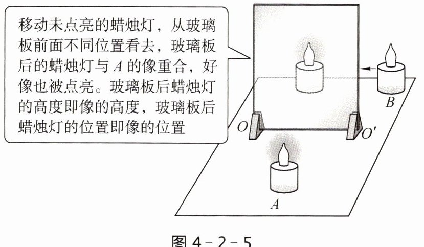 3. 如图4-2-5所示,在玻璃板后分别放置未点亮的另外三盏蜡烛灯B、C、D,移动玻璃板后的蜡烛灯寻找蜡烛灯A所成像的位置。