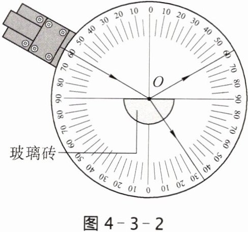 如图4-3-2所示,在光具盘中央放一块半圆形玻璃砖,打开激光源,一束激光从空气斜射向半圆形玻璃砖的中心O。