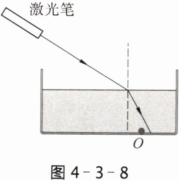 3. 在一敞口容器底部有个标记点O,用固定不动的激光笔将其照亮。激光从容器左上方某一高度斜射向水面,光斑在O点右侧,如图4-3-8所示。为使光斑向左移动到O点,可进行的操作是:保持激光射入角度不变,使水面____(选填“上升”或“下降”)。并在图中通过作图说明。