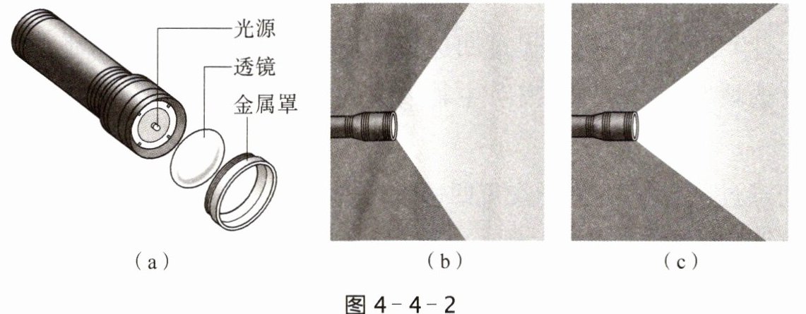 1. 图4-4-2(a)为手电筒示意图,它可拆分为光源、透镜和金属罩。将手电筒照向墙壁,图4-4-2(b)(c)分别为放入透镜前后的现象,可知该透镜对光线有____作用。若要使折射后的光线呈柱状照射得更远,应把光源放置在该透镜的____处。