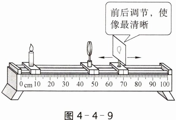 3. 如图4-4-9所示,把发光物放在距离凸透镜较远的位置,移动光屏找像。