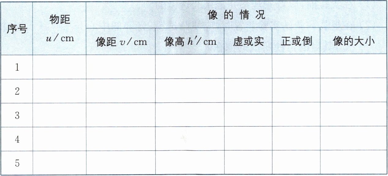 |序号|物距u/cm|像距v/cm|像高h'/cm|虚或实|正或倒|像的大小|