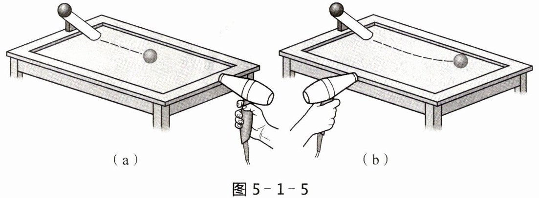 如图5-1-5(a)所示,让塑料小球从斜面上滚下,在它的运动路径上用电吹风正对着它吹,小球的运动状态如何变化?如图5-1-5(b)所示,用电吹风在塑料小球运动路径的侧方对其吹风,小球的运动状态又将如何变化?