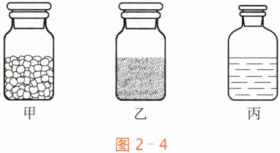 2. 生活中的一些操作与某些化学实验基本操作相仿,如用勺子取用食盐、向杯中倾倒饮料、用量杯或小滴管取用咳嗽糖浆等。将图 2 - 4 中甲、乙、丙三种试剂分别取到试管中,回答下列问题。