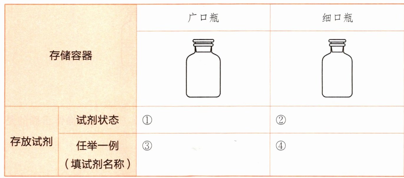 广口瓶和细口瓶是实验室中常见的两种存储容器,请观察实验室的试剂柜并完成下表。