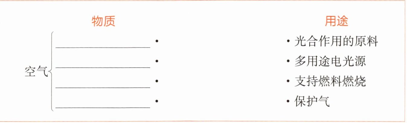 空气$\begin{cases}• \underline{\quad\quad} \\ • \underline{\quad\quad} \\ • \underline{\quad\quad} \\ • \underline{\quad\quad}\end{cases}\begin{matrix} \to \\ \to \\ \to \\ \to \end{matrix}\begin{matrix} \to \\ \to \\ \to \\ \to \begin{cases}• 光合作用的原料 \\ • 多用途电光源 \\ • 支持燃料燃烧 \\ • 保护气\end{cases}$