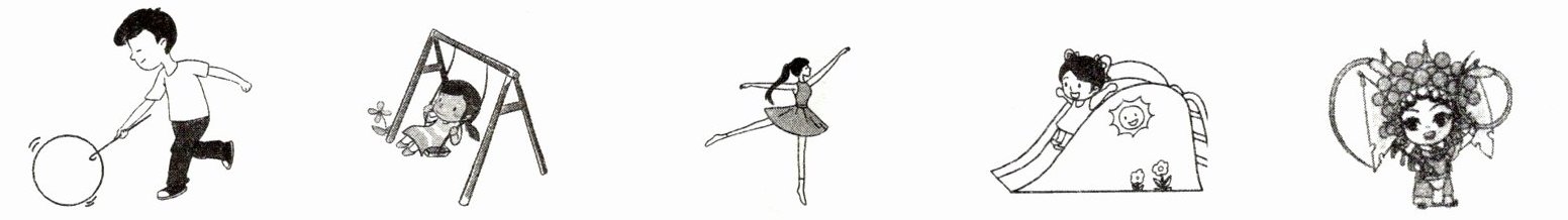 【答案】:(B)铁环 (A)秋千 (E)舞蹈 (C)滑梯 (D)京戏