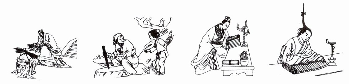 第四幅图:一个人把头发用绳子系在房梁上,用锥子刺大腿,这是“悬梁刺股”的典故,“悬梁刺股”形容刻苦学习。
