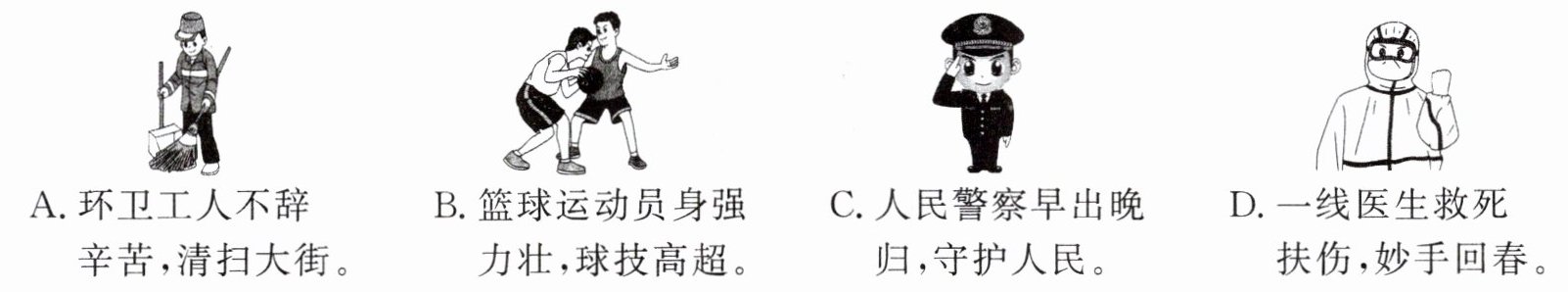 【解析】:本题考查对课文《落花生》中花生品质的理解,以及将这种品质与不同职业人群的特点进行类比的能力。《落花生》中花生具有默默奉献、不求名利的特点。A选项环卫工人不辞辛苦清扫大街,默默为城市环境付出;C选项人民警察早出晚归守护人民,默默奉献;D选项一线医生救死扶伤,也是默默奉献。而B选项篮球运动员身强力壮、球技高超,主要体现的是自身的身体素质和技能,与花生默默奉献的品质不相符。